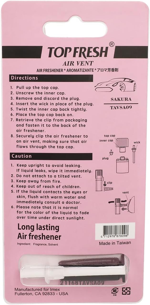 CAUTION: 1. Keep upright to avoid leaking. If liquid leaks, wipe it immediately. 2. Do not attach to a tiled vent. 3. Keep away from fire. 4. Keep out of reach of children. 5. If the liquid contacts the eyes or skin, flush with warm water and immediately consult a doctor. 6. Please note that it is normal for the color of the liquid to fade over time under direct sunlight.